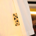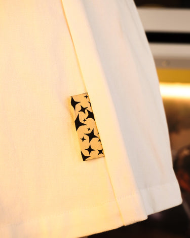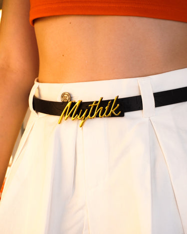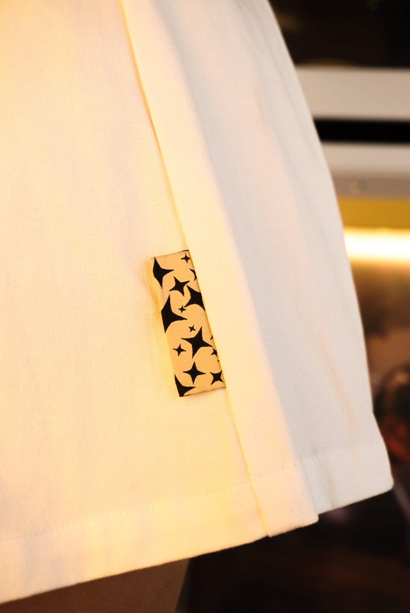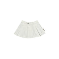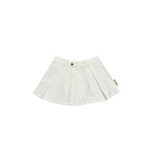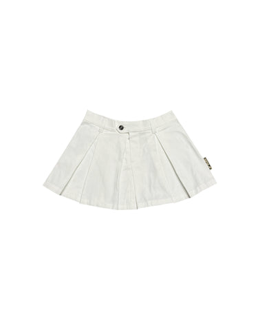 Pleated cotton skirt featuring custom button and woven tag on side.