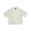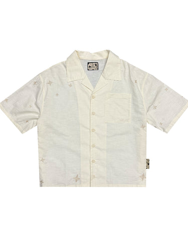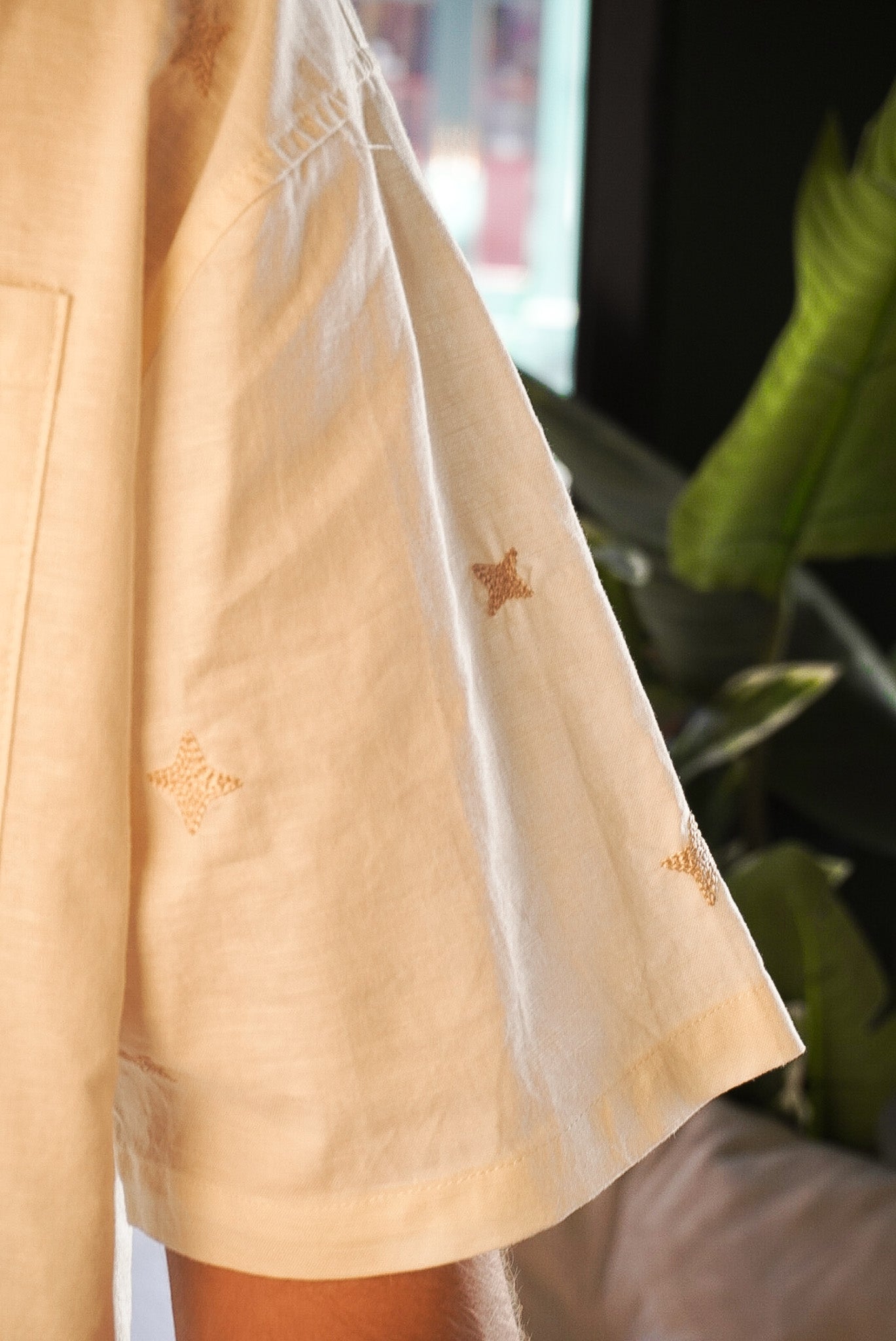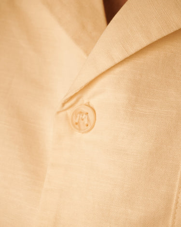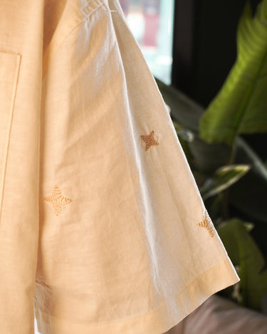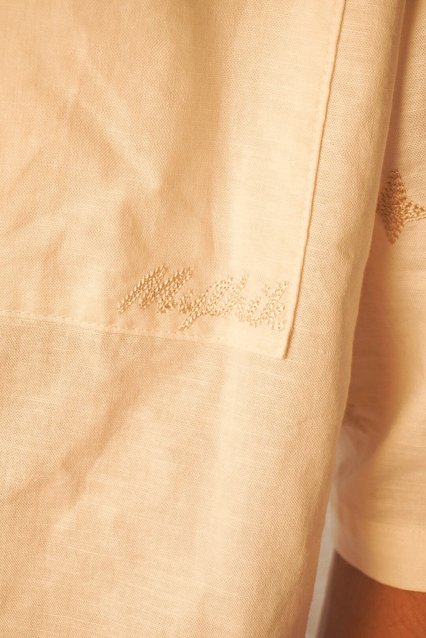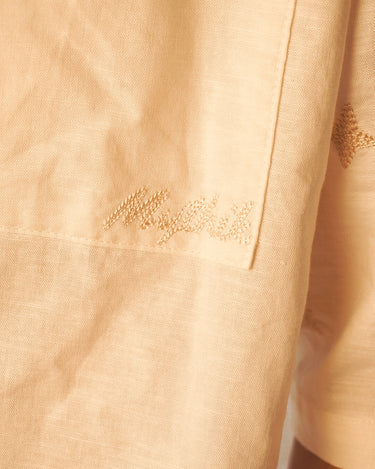 Medium-weight linen shirt featuring chain-stitch embroidered details throughout the body. Custom marbeled M buttons and side woven tag.